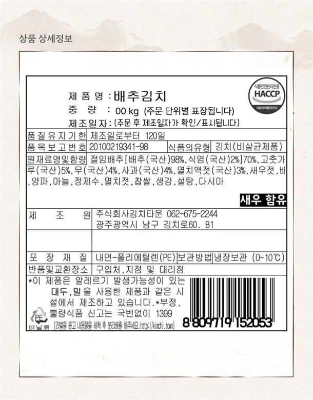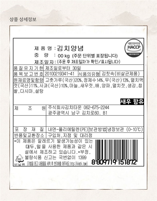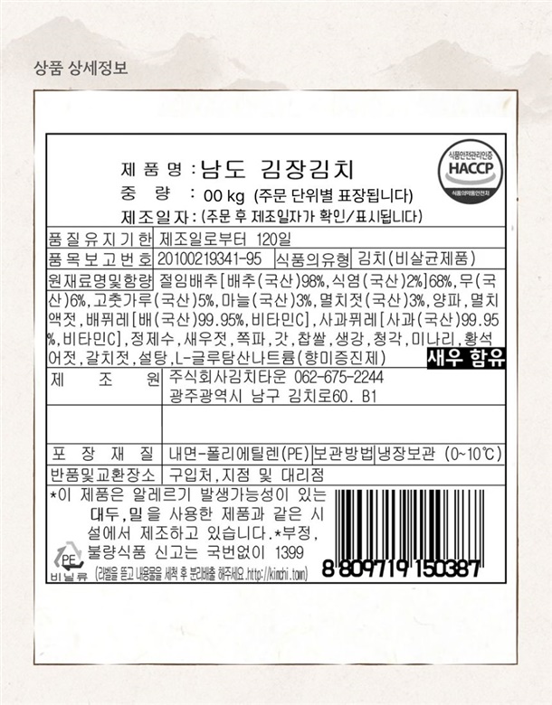 | 1. 「식품 등의 표시ㆍ광고에 관한 법률」 및 「식품등의 표시기준」에 따른 표시사항 | 상세페이지 참조 |